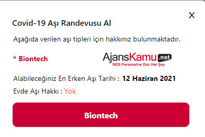 AjansKamu.Net olarak Biontech aşısı için randevu sorgulaması yaptığımızda, 12 Mayıs tarihi yerine 12 Haziran tarihine randevu verildiği bilgisiyle karşılaştık.