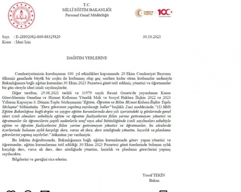 MEB tarafından yayımlanan resmi yazıda, 30 Ekim tarihindeki tatil nedeniyle öğretmenlere ödenecek ek ders ücretlerine dair detaylar açıklandı. Buna göre, 30 Ekim tatili nedeniyle okullarda görev almayan öğretmenlere, bu gün için ek ders ücreti ödeneceği belirtildi.