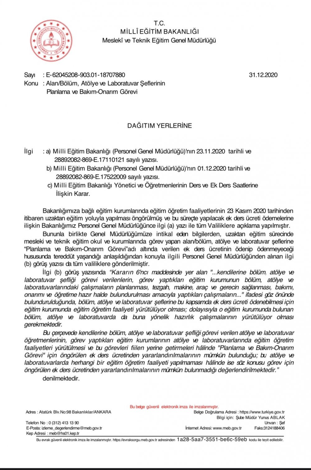 Milli Eğitim Bakanlığı Meslekî ve Teknik Eğitim Genel Müdürlüğü tarafından E-62045208-903.01-18707880 sayılı 31 Aralık 2020 tarihli Alan/Bölüm, Atölye ve Laboratuvar Şeflerinin Planlama ve Bakım-Onarım Görevi konulu resmi yazı yayınlandı.
