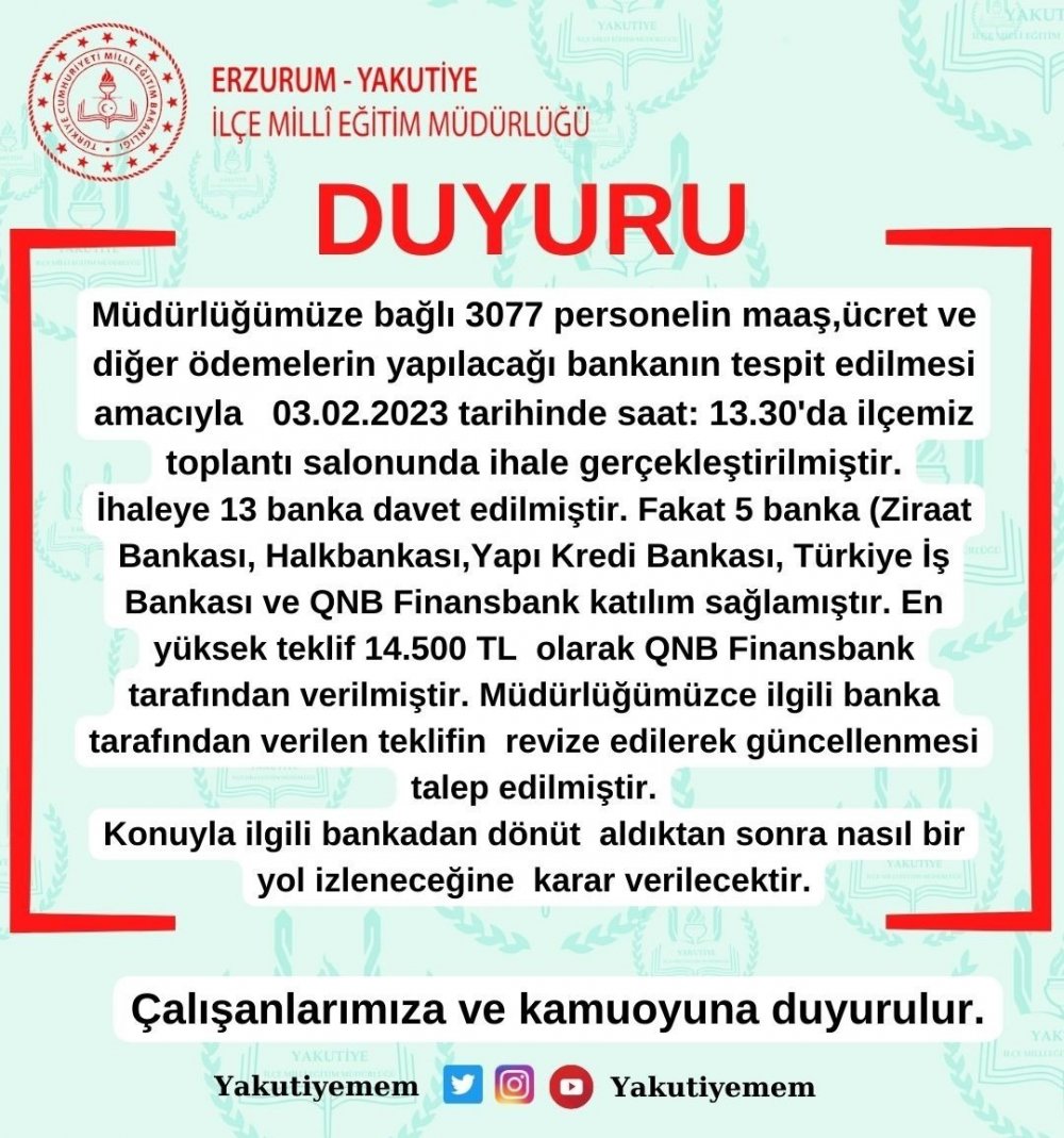 Promosyon ihalesinde bir haber de Erzurum/Yakutiye ilçe milli eğitim müdürlüğünden geldi.