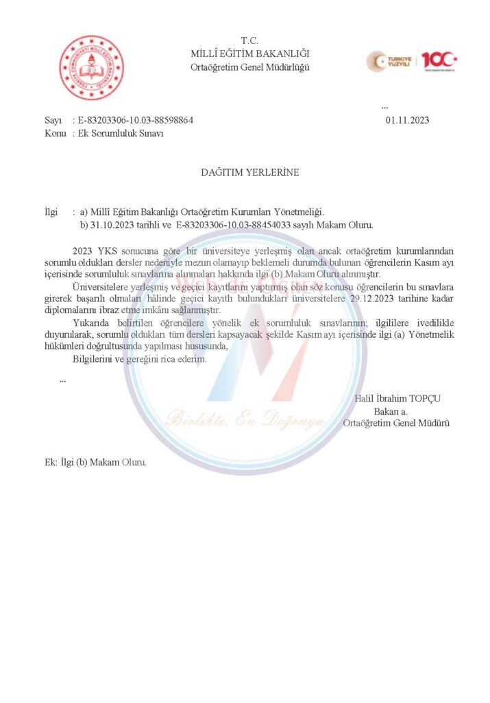Bakanlık tarafından yayımlanan resmi yazıya göre, 2023 YKS sonuçlarına göre üniversiteye yerleşen ancak lisede ki sorumlu dersleri sebebiyle beklemeli olan öğrenciler için ek sorumluluk sınavı yapılacak.