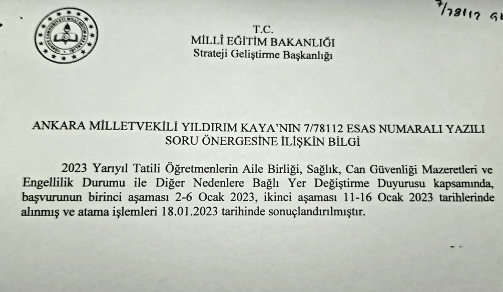 'Ankara Milletvekili Yıldırım Kaya'nın 7/78112 esas numaralı yazılı soru önergesine ilişkin bilgi' diyerek konu hakkında açıklama yapıldı.