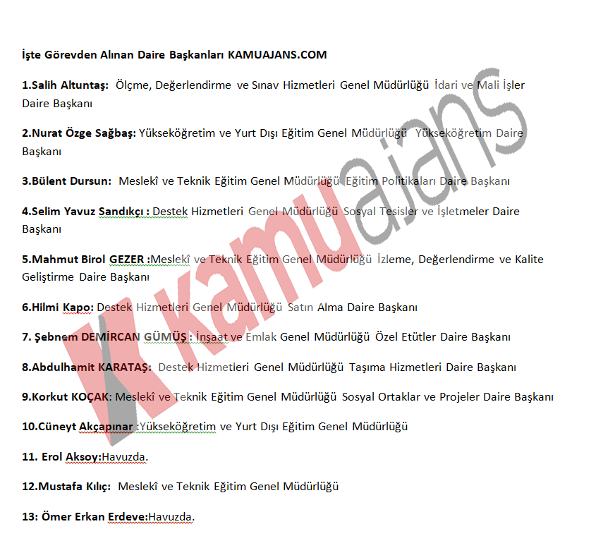 aldığımız bilgiler doğrultusunda MEB'de görevden alınan Daire Başkanları isimleri şöyle olurken sonraki haberlerimizde yeni atanan Daire Başkanları isimlerini bulabileceksiniz.