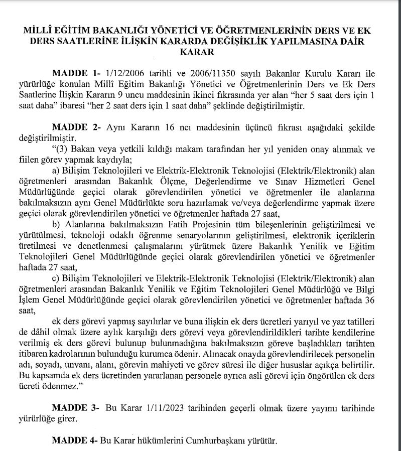 Milli Eğitim Bakanlığı Yönetici ve Öğretmenlerinin Ders ve Ek Ders Saatlerine İlişkin Kararda yapılan değişiklik ile birlikte, Bilişim ve elektrik elektronik Teknolojileri alanı öğretmeni olup, Milli Eğitim Bakanlığı Yenilik ve Eğitim Teknolojileri Genel Müdürlüğü ve Bilgi İşlem Genel Müdürlüğünde görevlendirilen öğretmenlere haftalık ödenecek ek ders ücreti 36 saate çıkarıldı.