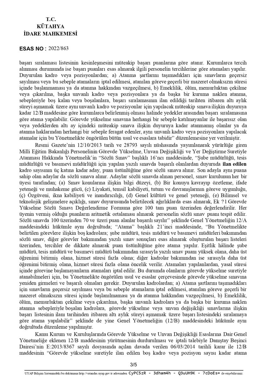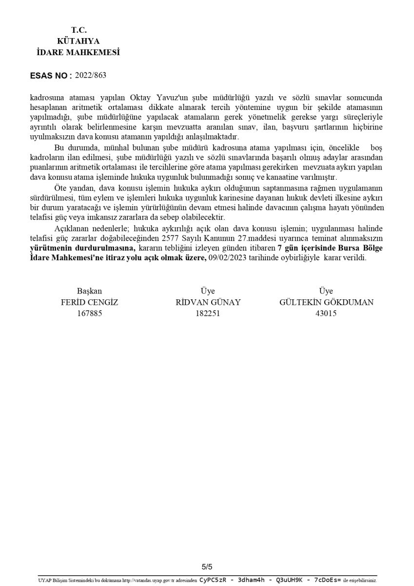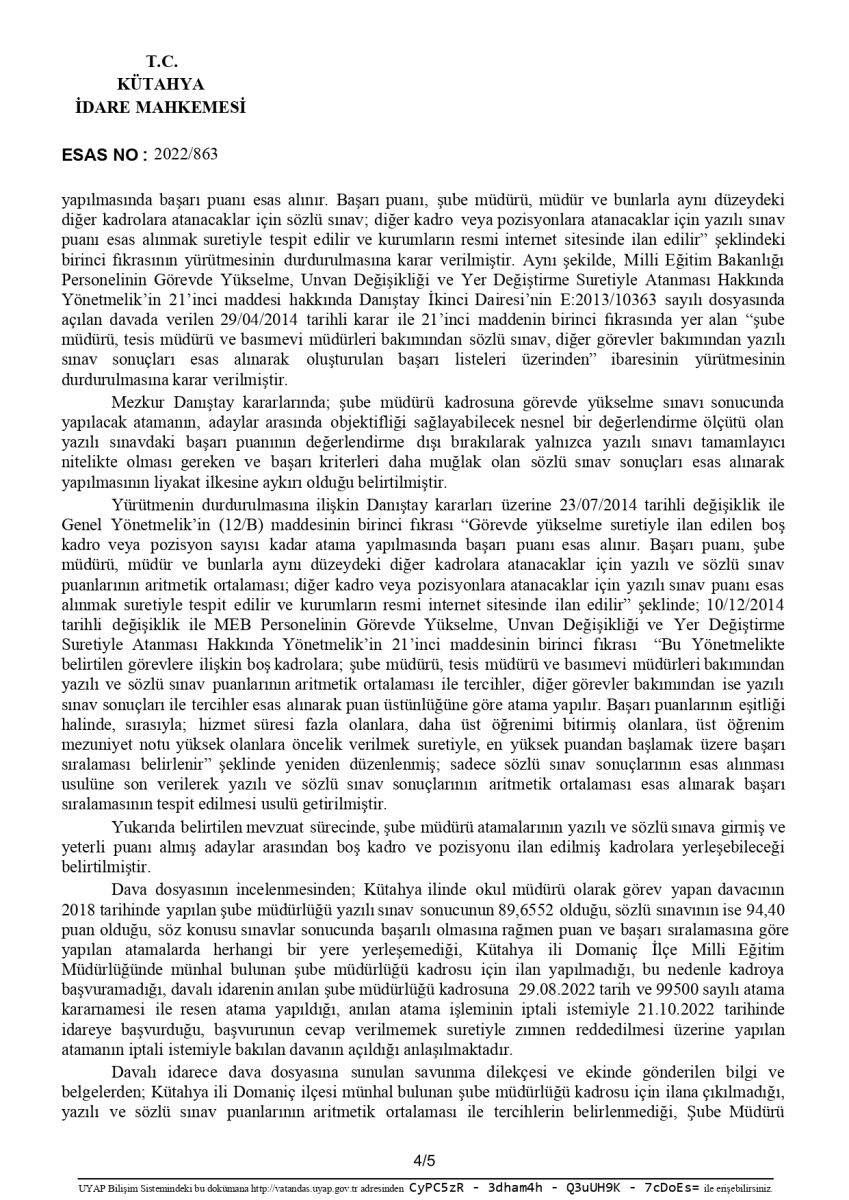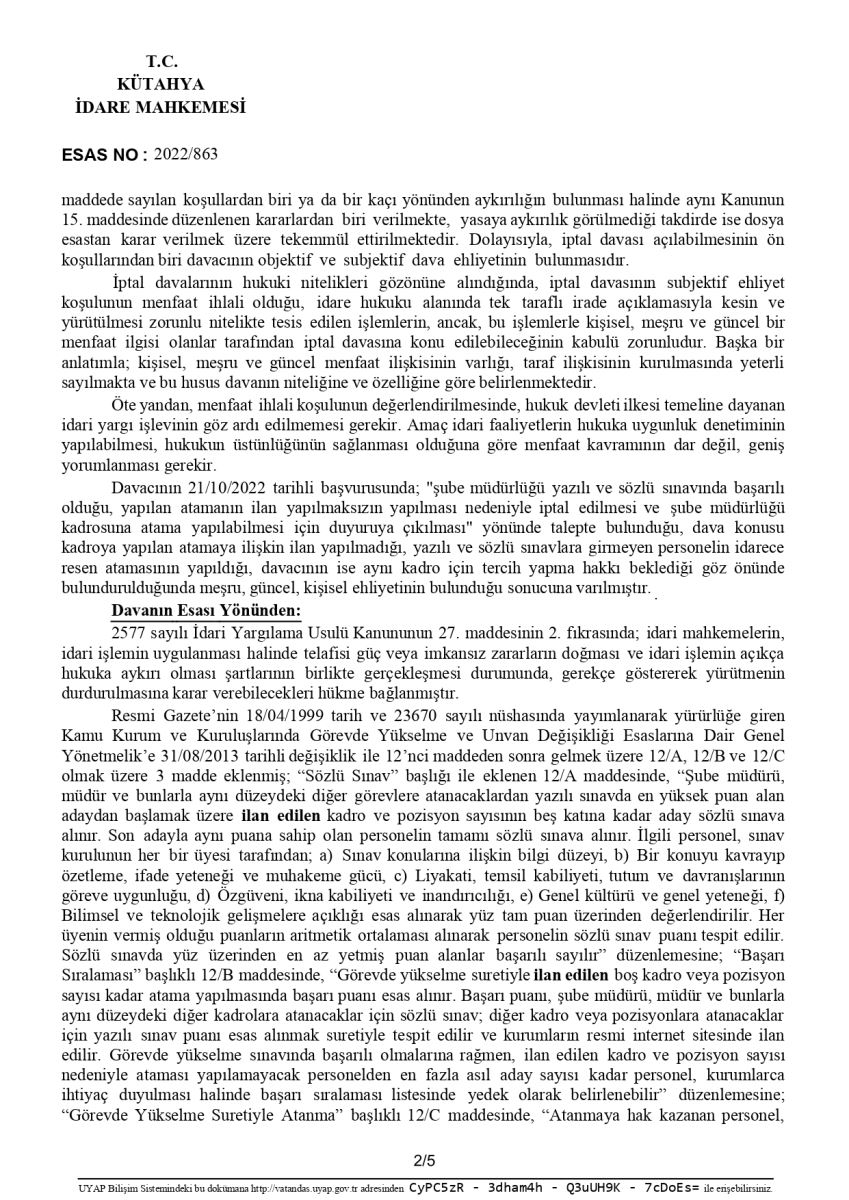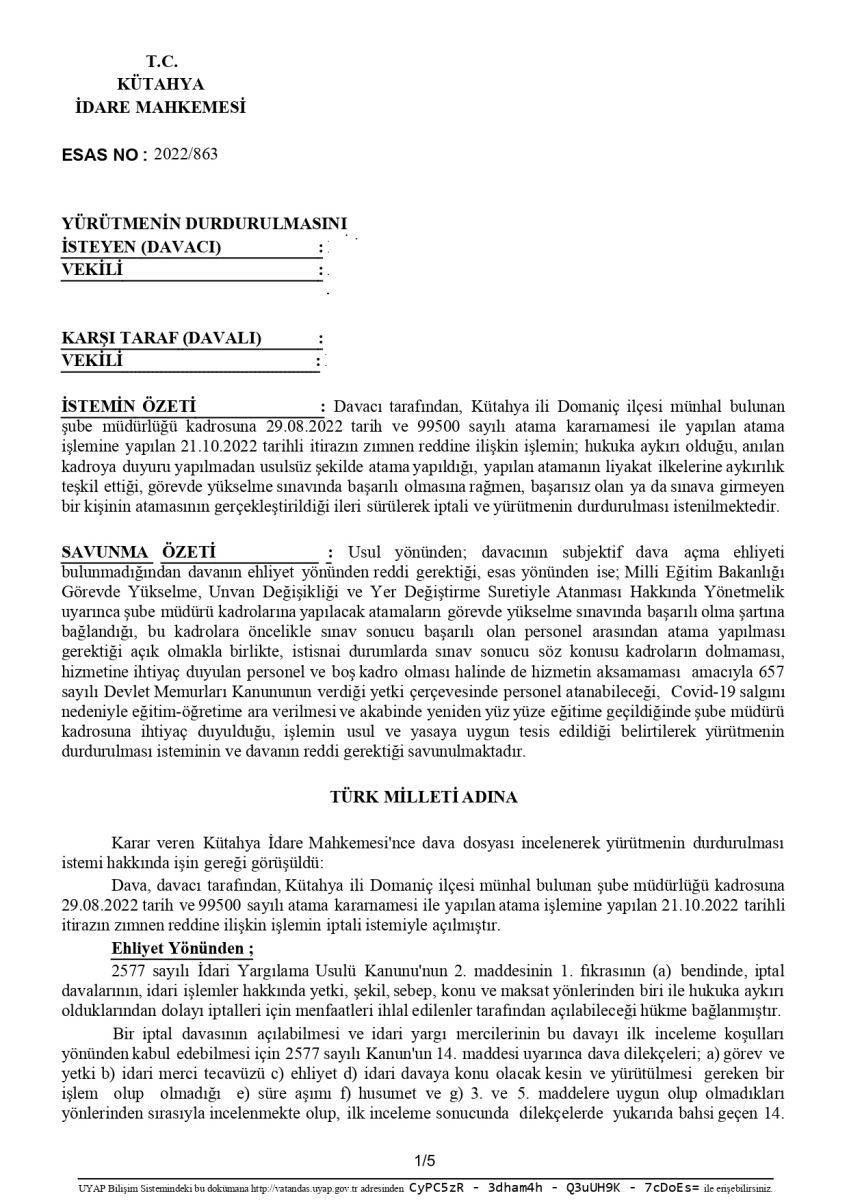 Mevzuatta açıkça şube müdürlüğüne atanma şartları belirtilmiş olmasına rağmen, Şube Müdürlüğüne atanma şartlarını taşımayan, hatta yapılan Şube Müdürlüğü sınavına müracaatı dahi bulunmayan, bir okulda görevli müdür yardımcısının; 76. Madde ile Kütahya/Domaniç İlçe Milli Eğitim Müdürlüğüne Şube Müdürü olarak atanmıştı. Şube Müdürlüğüne atanmak için gerçekleştirilen sınavda başarılı olmuş, şube müdürü olarak atanma hakkına haiz binlerce kişi olmasına rağmen; Milli Eğitim Bakanlığının hiçbir duyuruya çıkmadan, binlerce kişinin hakkını görmezden gelerek yaptığı bu Hakkaniyetten uzak, kariyer ve liyakat esaslarını hiçe sayan atamanın iptaliyle ilgili bir öğretmenin açtığı davada Kütahya İdare Mahkemesi yürütmenin durdurulması kararını verdi.