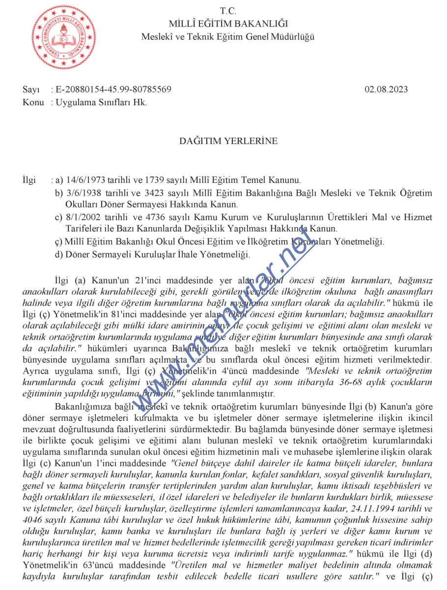 1739 sayılı Milli Eğitim Temel Kanununun 21'inci maddesinde yer alan "Okul öncesi eğitim kurumları, bağımsız anaokulları olarak kurulabileceği gibi, gerekli görülen yerlerde ilköğretim okuluna bağlı anasınıfları halinde veya ilgili diğer öğretim kurumlarına bağlı uygulama sınıfları olarak da açılabilir." hükmü ile Milli Eğitim Bakanlığı Okul Öncesi Eğitim ve İlköğretim Kurumları Yönetmeliğinin 81'inci maddesinde yer alan "Okul öncesi eğitim kurumları; bağımsız anaokulları olarak açılabileceği gibi mülki idare amirinin onayı ile çocuk gelişimi ve eğitimi alanı olan mesleki ve teknik ortaöğretim kurumlarında uygulama sınıfı ve diğer eğitim kurumları bünyesinde ana sınıfı olarak da açılabilir." hükümleri uyarınca Bakanlığımıza bağlı mesleki ve teknik ortaöğretim kurumları bünyesinde uygulama sınıfları açılmakta ve bu sınıflarda okul öncesi eğitim hizmeti verilmektedir.