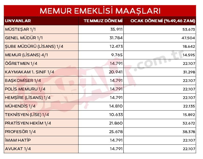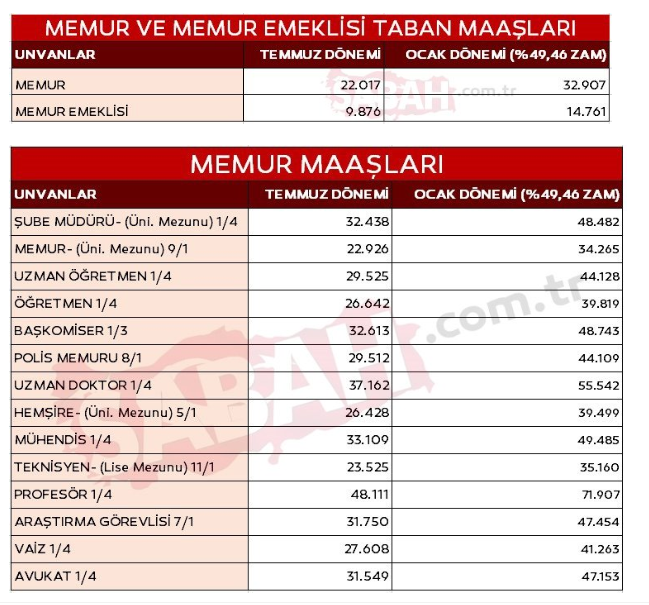 EMEKLİ VE MEMURUN ZAM TABLOSU