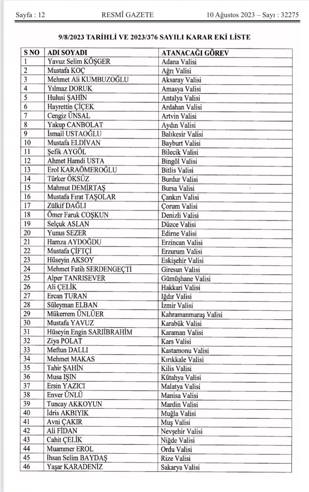 2023 Valiler Kararnamesi Yayınlandı 46 Vali Ataması yapıldı. Atama Kararları 10 Ağustos tarihli resmi gazetede yayımlandı.