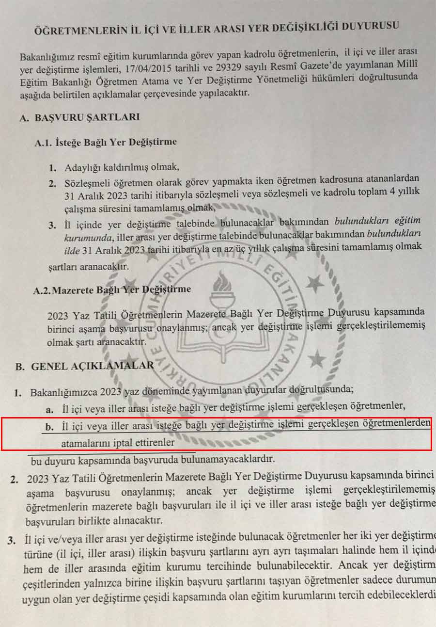 "İl içi veya iller arası isteğe bağlı yer değiştirme işlemi gerçekleşen öğretmenlerden atamalarını iptal ettirenler bu duyuru kapsamında başvuruda bulunamayacaklardır"