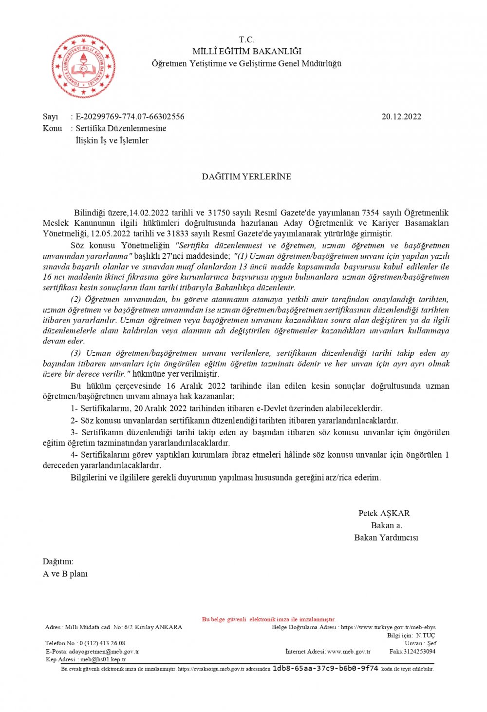 Meb tarafından Öğretmen Yetiştirme ve Geliştirme Genel Müdürlüğü tarafında 20.12.2022 tarihli Sertifika Düzenlenmesine İlişkin İş ve İşlemler konulu resmi yazıda uzman öğretmenlik ünvanı alan öğretmenlerin ;