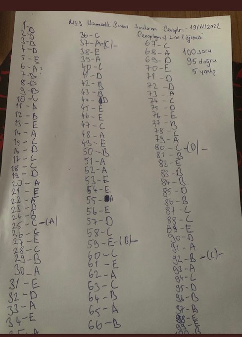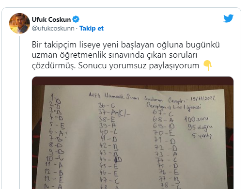Milat Gazetesi yazarı Ufuk Coşkun tam bu noktada yorumsuz olarak paylaşımı yaptığı gönderide Bir takipçim liseye yeni başlayan oğluna bugünkü uzman öğretmenlik sınavında çıkan soruları çözdürmüş. Sonucu yorumsuz paylaşıyorum şu ifadelere yer verirken Lise 1 Öğrencisinin 100 sorudan 95 soruya doğru cevap verdiği görüldü.