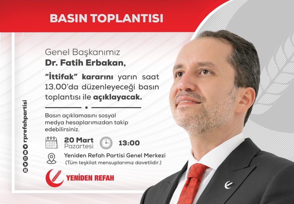 Yeniden Refah Partisi Genel Başkanı Fatih ERBAKAN Ak Parti'den gelen Cumhur İttifakına Katılım teklifine dair kararlarını yarın açıklayacaklarını duyurdu.