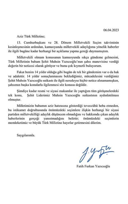 Şehit Muhsin Yazıcıoğlu'nun oğlu Fatih Furkan Yazıcıoğlu yazılı açıklama yaparak CHP'den Milletvekili Adayı olacağı iddialarını yalanladı.