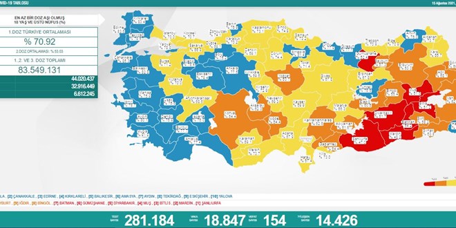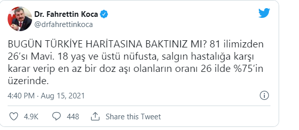 Sağlık Bakanı Fahrettin Koca, sosyal medya hesabından aşı haritasının değişimine dair bilgilere değinen paylaşımında, "Bugün Türkiye haritasına baktınız mı? 81 ilimizden 26'sı Mavi. 18 yaş ve üstü nüfusta, salgın hastalığa karşı karar verip en az bir doz aşı olanların oranı 26 ilde yüzde 75'in üzerinde. Sağlık için birlik olalım. Hepimiz ilk doz aşılarımızı yaptıralım" ifadelerine yer verdi.