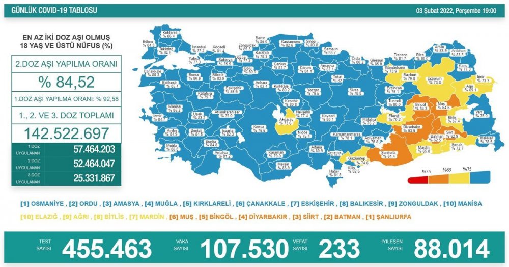 18 yaş ve üzeri nüfusun aşılanması verilerinde 1’inci doz Türkiye ortalaması yüzde 92.58, 2’nci doz ortalaması yüzde 84.52 olarak ölçüldü. Ayrıca, 1’inci dozda 57 milyon 464 bin 203, 2’nci dozda 52 milyon 464 bin 47 ve 3’üncü dozda 25 milyon 331 bin 867 olmak üzere toplam 142 milyon 522 bin 697 aşı uygulandı.