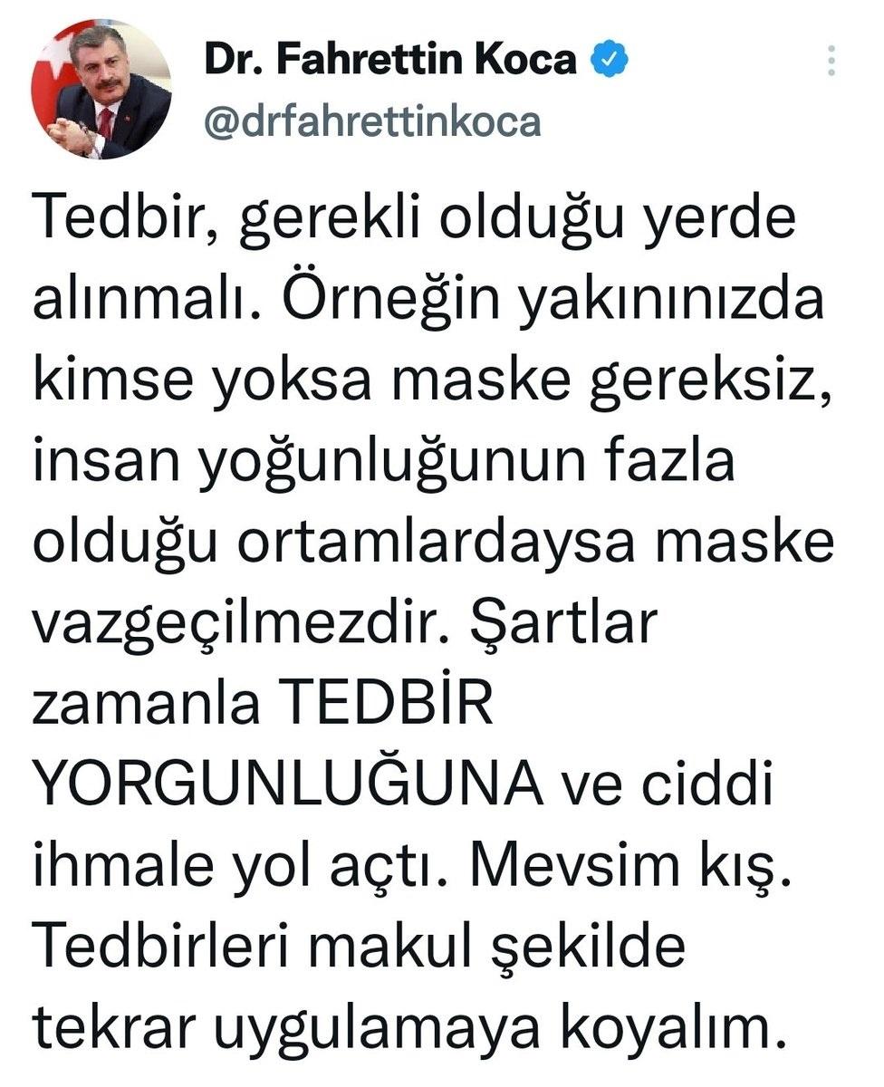 Sağlık Bakanı Fahrettin Koca, yakınınızda kimse yoksa maske gereksiz demiş. Daha önce bunu söyleyenler linç ediliyordu. Bakan bey 2 yıl sonra bu noktaya gelebilmiş. Bu da bir gelişme! Okullarda çocuklar gün boyu nefessiz kalıyor, geç olmadan bakan bey bu konuya da bir el atsa.