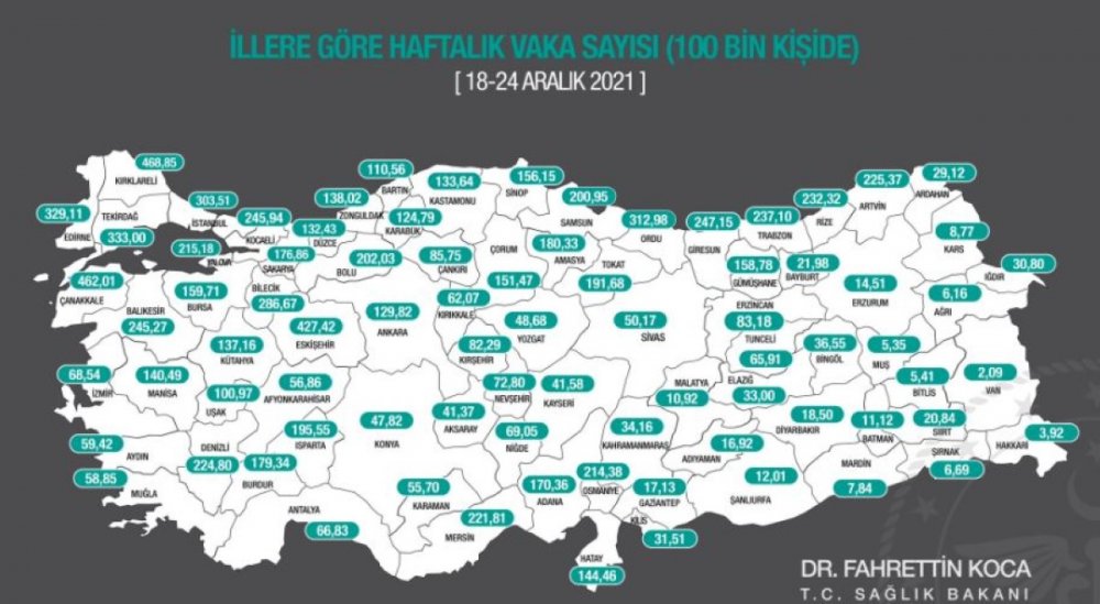 Sağlık Bakanı Fahrettin Koca, 18-24 Aralık tarihleri arasında illere göre Covid-19 vaka sayılarını açıkladı