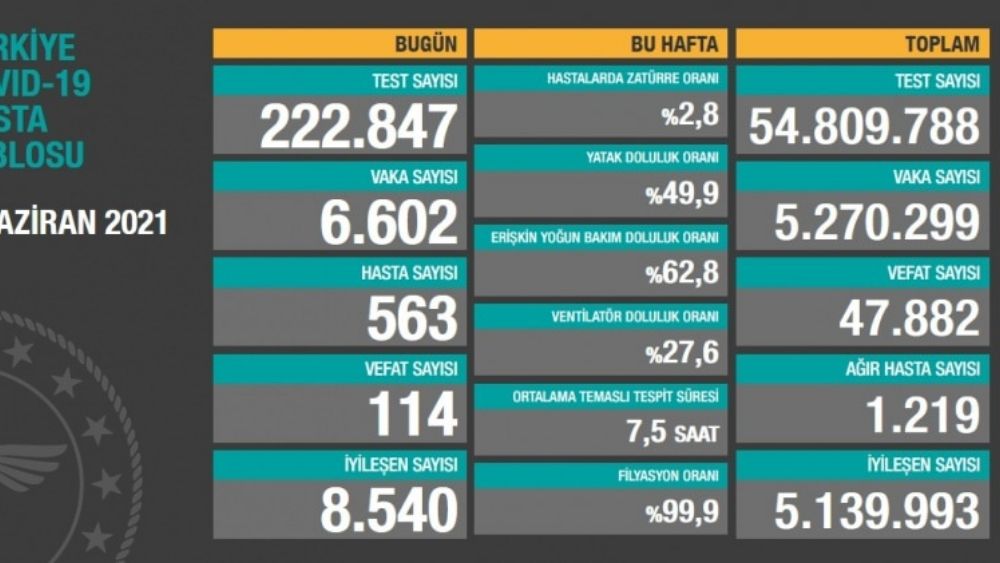 Sağlık Bakanlığının Covid-19 bilgilendirme sayfasında Türkiye’nin güncel korona virüs tablosu kamuoyuyla paylaşıldı. Tabloya göre, son 24 saatte 114 kişi korona virüsten hayatını kaybetti, toplam can kaybı 47 bin 882’a yükseldi. Toplamda 54 milyon 809 bin 788 test yapıldı. Bugün yapılan 222 bin 847 testten, 6 bin 602 yeni vaka sayısı, 563 kişi de yeni hasta sayısı olduğu belirtildi. Toplam vaka sayısının 5 milyon 270 bin 299 olduğu, bugün iyileşen 8 bin 540 kişiyle birlikte toplam iyileşen hasta sayısının 5 milyon 139 bin 993’e yükseldiği, toplam hastalarda zatürre oranının yüzde 2,8, ağır hasta sayısının ise bin 219 olduğu açıklandı.