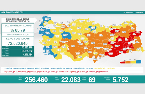 Sağlık Bakanlığı tarafından Türkiye’nin yeni korona virüs tablosu açıklandı. 30 Temmuz’da açıklanan 24 saatlik verilere göre 22 bin 83 vaka tespit edildi. Virüs nedeniyle hayatını kaybedenlerin sayısı 69 oldu. Son 1 günde toplam 256 bin 460 test yapılırken, iyileşen hasta sayısı 5 bin 752 olarak kaydedildi. Sağlık Bakanlığı tarafından açıklanan tabloda, aşılama verilerine de yer verildi. En az 1 doz aşı olmuş 18 yaş üzeri nüfusu kapsayan verilere göre Türkiye’de 1. doz aşılama ortalama yüzde 65,79 oldu. 2. doz ortalaması yüzde 43,28 olurken, 1., 2. ve 3. doz aşısını olan vatandaş sayısı toplamda 72 milyon 520 bin 645’e yükseldi.