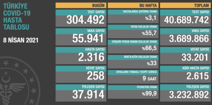 Sağlık Bakanlığının Covid-19 bilgilendirme sayfasında Türkiye’nin güncel korona virüs tablosu kamuoyuyla paylaşıldı. Tabloya göre son 24 saatte 258 kişi korona virüsten hayatını kaybetti, toplam can kaybı 33 bin 201’a yükseldi. Toplamda 40 milyon 689 bin 742 test yapıldı. Bugün yapılan 304 bin 492 testten, 55 bin 941 yeni vaka sayısı, 2 bin 316 kişi de yeni hasta sayısı olduğu belirtildi. Toplam vaka sayısının 3 milyon 689 bin 866 olduğu, bugün iyileşen 37 bin 914 kişiyle birlikte toplam iyileşen hasta sayısının 3 milyon 232 bin 892’e yükseldiği, toplam hastalarda zatürre oranının yüzde 3,1, ağır hasta sayısının ise 2 bin 615 olduğu açıklandı.
