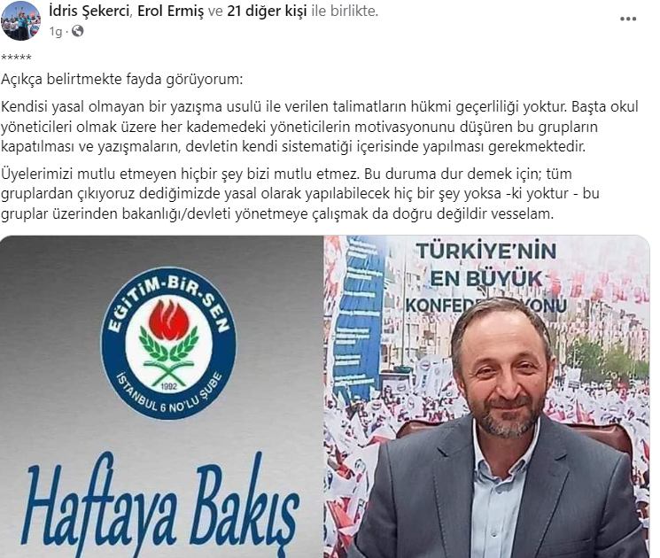 İstanbul Eğitim Bir Sen 6 No'lu Şube Başkanı İdris Şekerci sosyal medya hesabından MEB'in Whatsapp gruplarını kapatması gerektiğini ve tüm üyelerine gruplardan çıkın demeleri halinde yetkililerin yasal olarak yapabileceği bir şeyin olmadığını ifade etti.