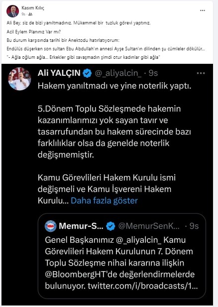 Eğitim-Mil-Sen Genel Başkanı Kasım Kılıç, sosyal medya platformunda Memur Sen Genel Başkanı Ali Yalçın'ın "Hakem yanıltmadı ve yine noterlik yaptı." açıklamasını alıntılayarak;
