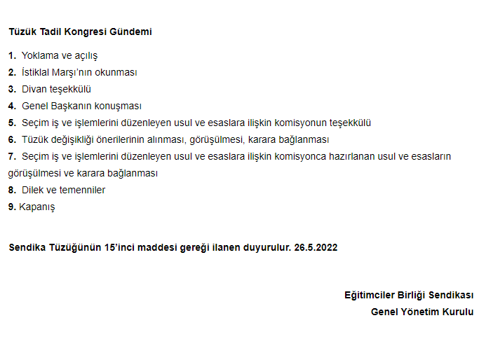 Eğitim-Bir-Sen Genel Merkezi, Genel Kurul (Tüzük Tadil Kongresi) ilanına çıktı.