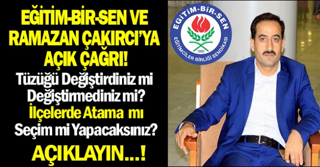 Bunun üzerine Eğitim Bir Sen'e ve Ramazan ÇAKIRCI'ya Açık Çğrı Açıklayın! başlıklı haberimizle çağrı yapmış ve Daha önce yapılan tüzük tadilatıyla İlçe temsilciliklerine seçimin yerine atama getirleceğini bunu da seçim zamanında çıkarılacak bir yöçetmelik eliyle yapılacağını ortaya koymuştuk.