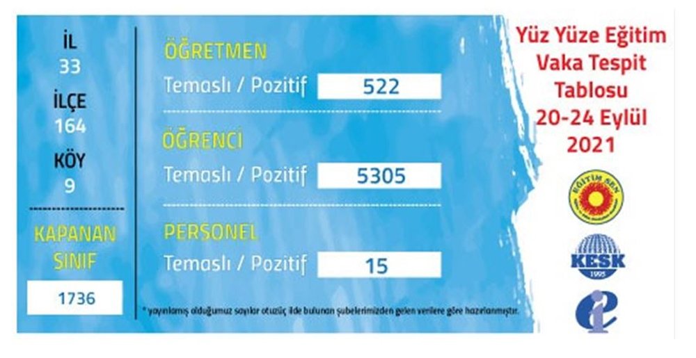 * Tüm tedbirlerin alınması onların eğitim ortamlarındaki psikolojik ve duygusal yeterlilikleri için önemlidir. Ancak bu hafta sendikamıza ulaşan vaka sayılarına göre, okullarda temaslı ve pozitif öğretmen sayısı 522, temaslı ve pozitif öğrenci sayısı 5 bin 305, temaslı ve pozitif personel sayısı 15 olmuştur. Kapanan sınıf sayısı bin 736'dir.