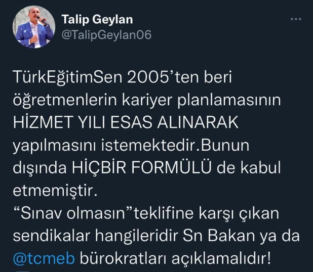Türk Eğitim Sen genel başkanı Talip Geylan,Milli Eğitim Bakanı Mahmut Özer'e “Sınav olmasın”teklifine karşı çıkan sendikalar hangileridir Sn Bakan ya da bürokratları açıklamalıdır!