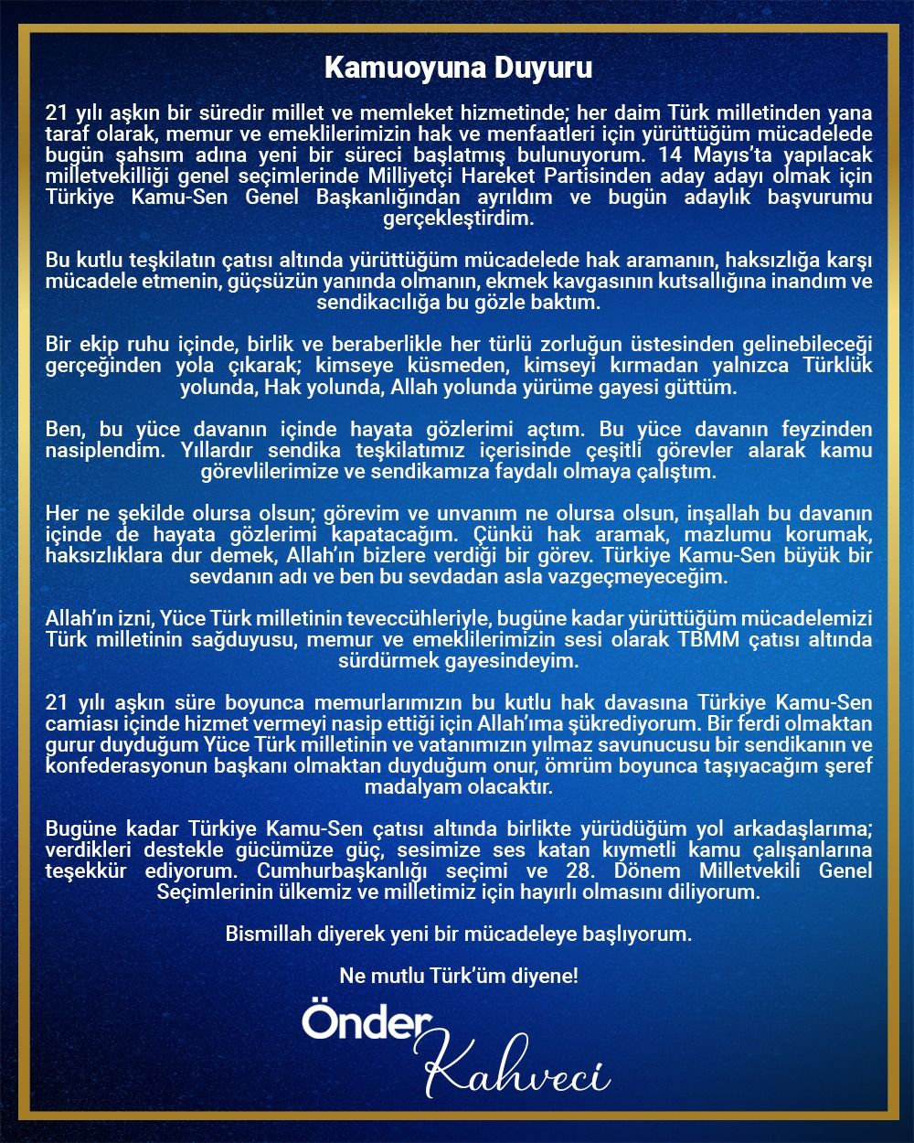 Kamu-Sen Genel Başkanı Önder Kahveci Milliyetçi Hareket Partisi (MHP) milletvekili olabilmek için görevinden istifa ederek milletvekilliği aday adaylığı başvurusunda bulundu.