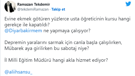Sosyal medya hesabından yaptığı paylaşımla Diyarbakır İl Milli Eğitim Müdürlüğü ve Diyarbakır Valisi Ali İhsan Su'yu da etiketleyen Eğitim Bir Sen Diyarbakır 1 Nolu Şube Başkanı Ramazan Tekdemir, şu ifadeleri kullandı: