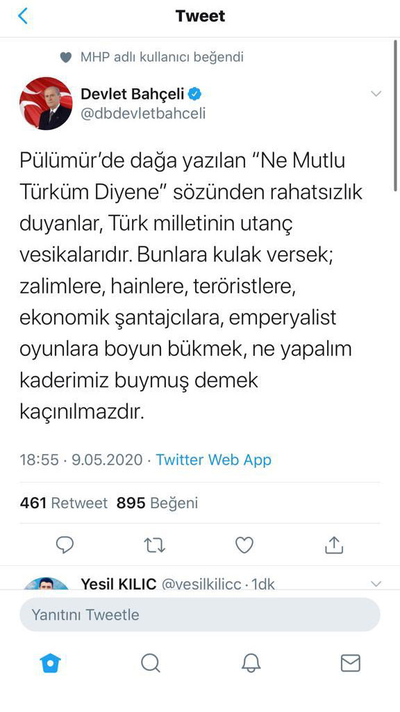 “Pülümür’de dağa yazılan “Ne Mutlu Türküm Diyene” sözünden rahatsızlık duyanlar, Türk milletinin utanç vesikalarıdır. Bunlara kulak versek; zalimlere, hainlere, teröristlere, ekonomik şantajcılara, emperyalist oyunlara boyun bükmek, ne yapalım kaderimiz buymuş demek kaçınılmazdır. Dedi .