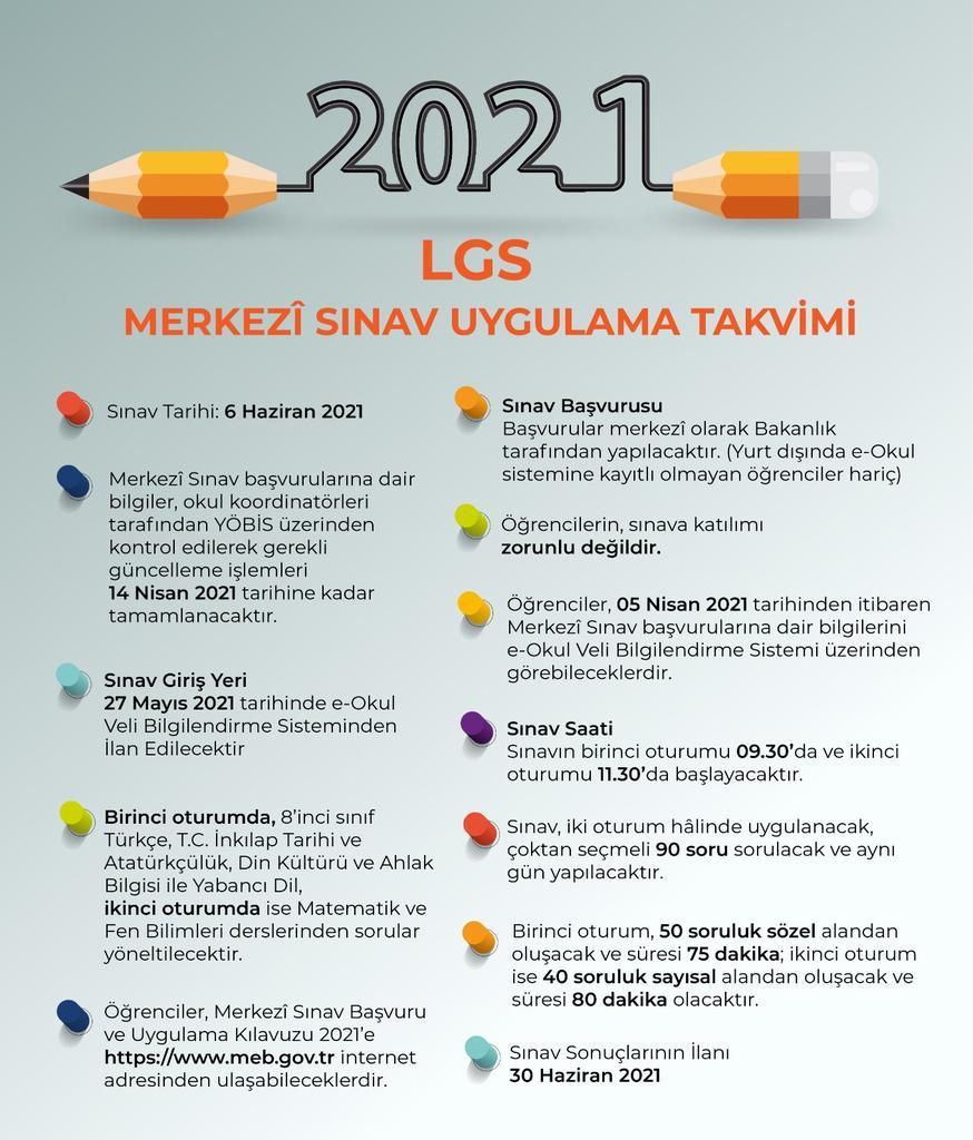 Milli Eğitim Bakanlığı (MEB) tarafından 6 Haziran'da uygulanacak olan Liselere Geçiş Sınavı (LGS) başvuru kılavuzu yayımlandı. Kılavuza göre LGS başvuruları, 5-14 Nisan 2021 arasında Bakanlık tarafından merkezi olarak gerçekleştirilecek.