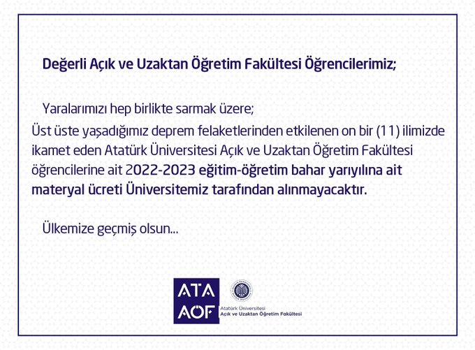 Üst üste yaşadığımız deprem felaketlerinden etkilenen on bir (11) ilimizde ikamet eden Atatürk Üniversitesi Açık ve Uzaktan Öğretim Fakültesi öğrencilerine ait 2022-2023 eğitim-öğretim bahar yarıyılına ait materyal ücreti Üniversitemiz tarafından alınmayacaktır