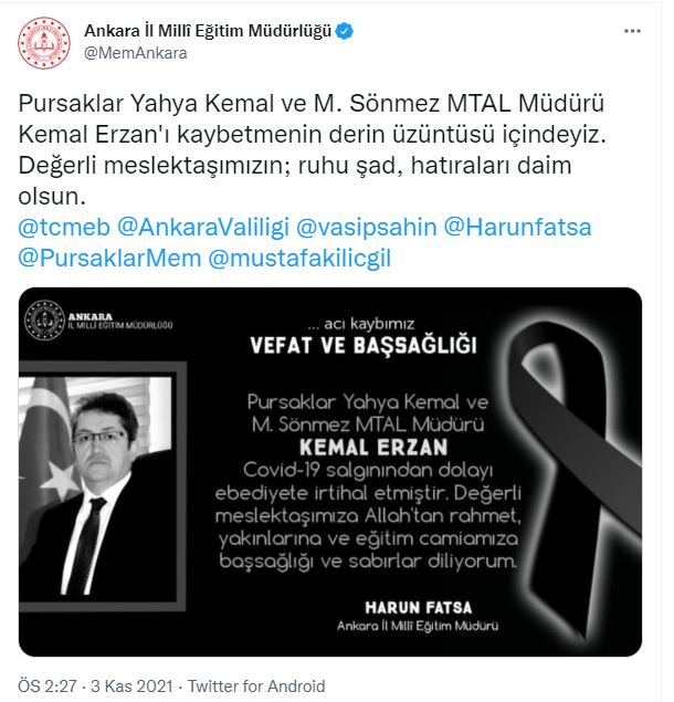 Pursaklar'da okul müdürü olarak görevine devam eden Kemal Erzan edinilen bilgiye göre covid-19 koronavirüs sebebiyle tedavi gördüğü hastanede sabah saatlerinde hayatını kaybetti.