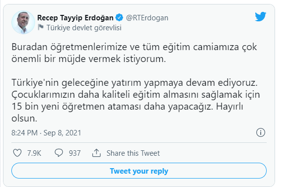 Cumhurbaşkanı Recep Tayyip Erdoğan, 'Çocuklarımızın daha kaliteli eğitim almasını sağlamak için 15 bin yeni öğretmen ataması daha yapacağız. Hayırlı olsun.' dedi.