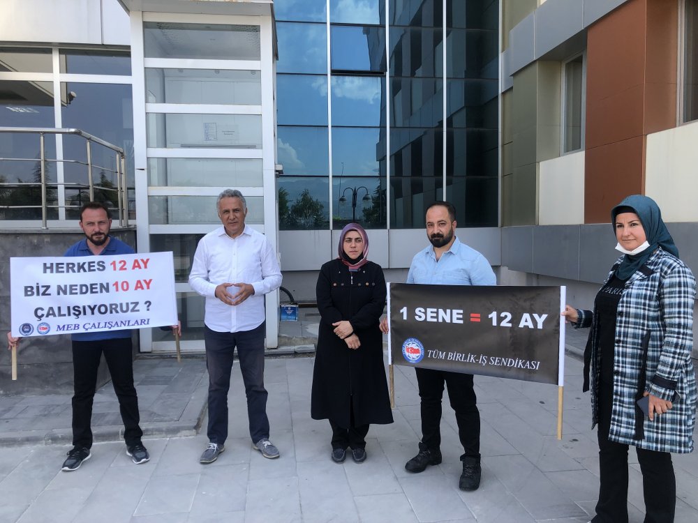 Tüm-İş Genel Başkanı Mahmut Şahin, Tüm-İş Konfederasyonu Disiplin Kurulu Başkanı Umut Karademir, Tüm Sağlık- İş Sendikası Genel Başkanı Muhsine Kahveci ve Tüm Sağlık- İş Yönetim Kurulu Üyesi Yeliz Erciyes ile birlikte Kayseri İl Milli Eğitim Müdürlüğü önünde basın açıklaması düzenledi. Burada konuşan Şahin, 30 bine yakın işçiye bakanlık tarafındanvüvey evlat muamelesi yapıldığını söyleyerek, "Şu anda 1 milyondan fazla çalışanı olan bir bakanlığın biriminin önündeyiz. Burada her yıl 12 ay boyunca 1 milyondan fazla insan maaşını alır, sosyal güvencesi de sağlanır. Yaz aylarında okulların tatil olmasına rağmen 900 binden fazla öğretmen de idari personel de maaşını alır ki sayı bir milyondan fazla. Fakat bu kurumda maalesef bir öz evlatlar var bir de üvey evlatlar var. Biz bugün buraya üvey evlatların sorunlarını dile getirmek için geldik. 30 binin altında ve 1 milyon üzeri çalışan, yani yüzde 3 bile olmayan bir sayıya Milli Eğitim Bakanlığı bir ayrımcılık yapıyor. Ne yapıyor, yaz aylarında ki tatillerde 900 binden fazla insan maaşını alıyor tatil olmasına rağmen. Sosyal güvencesi devam ediyor ama Milli Eğitim Bakanlığı’nın kadrolu işçisi, 30 bine yakın insan maalesef yaz aylarında okullar kapanınca hadi gidin işinize deniyor. 10 ay çalıştınız bendensiniz ama 2 ay gidin ne yaparsanız yapın. Yani üvey evlat muamelesi yapılıyor. 2 ay boyunca ne maaşları veriliyor ne de sosyal güvenceleri yatırılıyor. Yani bu insanlara deniyor ki o 2 ay boyunca ne yaparsanız yapın beni ilgilendirmiyor, gidin ben sizi maaş vermeyeceğim, sosyal haklarınızı da sağlamayacağım deniyor. Bu insanlardan verim bekleniyor. Bakın yaz ayları yaklaştıkça bu insanlarda o 2 ayı nasıl geçireceğim. Hele tek kişi çalışıyorsa o şartlarda o evin geçimini sağlamak, o psikoloji ve kendi ülkemiz, Milli Eğitim Bakanlığımız yani eğitimi düzgün yapması gereken, sağlıklı nesiller yetiştirmesi gereken bir bakanlık, adeta 30 bin aileye o 2 ay boyunca strese gir, sıkıntıya gir beni ilgilendirmiyor. Yani iş barışının sağlanmadığı, iş huzurunun sağlanmadığı ve üvey evlat muamelesi görüldüğü bir durum” dedi.