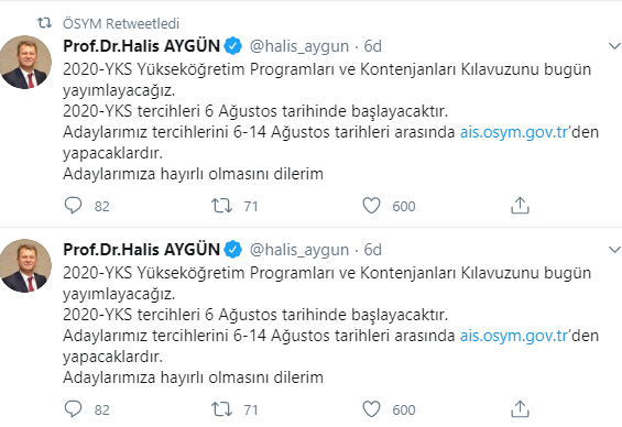 Ölçme Seçme ve Yerleştirme Merkezi Başkanı Prof. Dr. Halis Aygün 2020 YKS tercih kılavuzunun yayımlanacağı tarihi ve tercihlerin başlayacağı tarihi duyurdu.