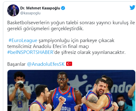 Gençlik ve Spor Bakanı Mehmet Kasapoğlu, THY Avrupa Ligi final maçı Anadolu Efes-Barcelona karşılaşmasının 21.30'da beIN Sports Haber kanalından şifresiz yayımlanacağını açıkladı.