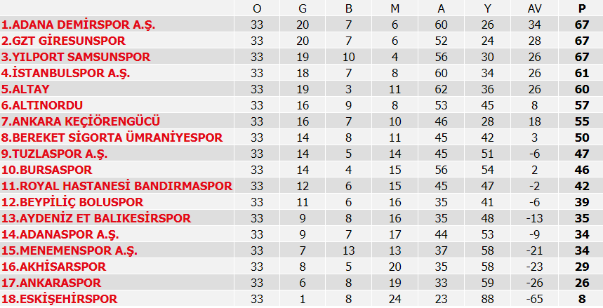 TFF 1. Lig'de Süper Lig biletini alacak takımlar son hafta belli olacak. Aynı puana sahip ve sırasıyla Adana Demirspor, Giresunspor ve Samsunspor şeklinde sıralanan takımlar 34. haftada galibiyet arayacak. İlk iki sıradaki takımlar galip gelirse Samsunspor play-off'ta mücadele edecek. Düşen 3. takım da Akhisarspor oldu.
