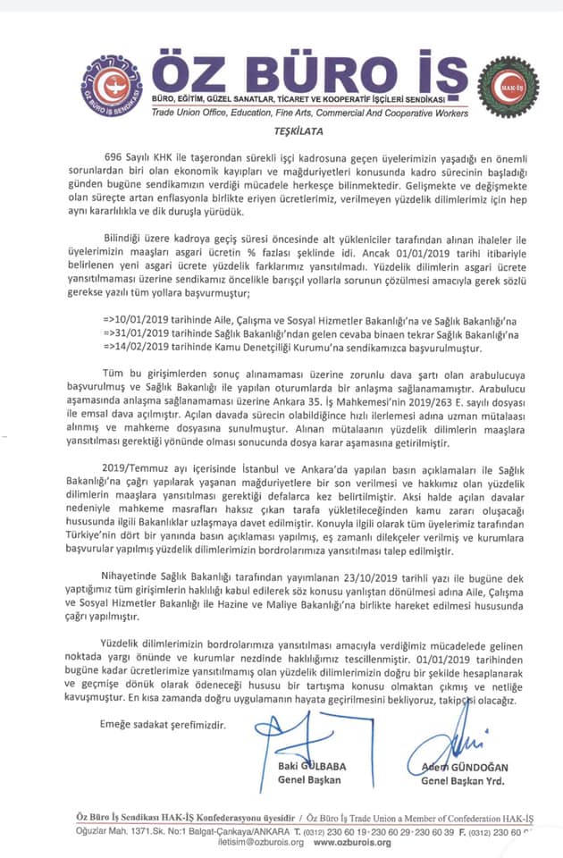Kadroya geçiş öncesi taşeronların maaşlarının asgari ücretin % fazlası şeklinde olduğunu hatırlatan sendika, 1 Ocak 2019 itibari ile bu farkların maaşlara yansıtılmadığını söyledi. Bu nedenle Öz Büro-İş’in barışçıl yollarla diyalog ile gerekli duyuruları yaptığı belirtilen açıklamada sendikanın Sağlık Bakanlığı, Aile Çalışma ve Sosyal Hizmetler Bakanlığı ve KDK’ya başvurduğunu söyledi.
